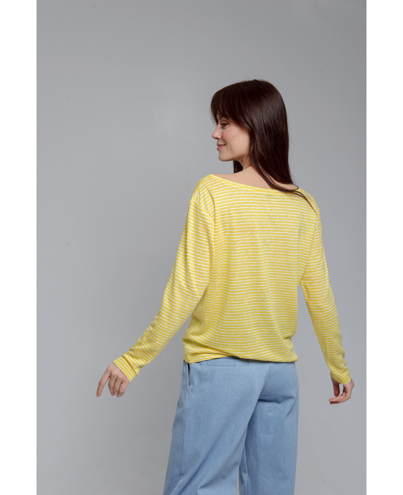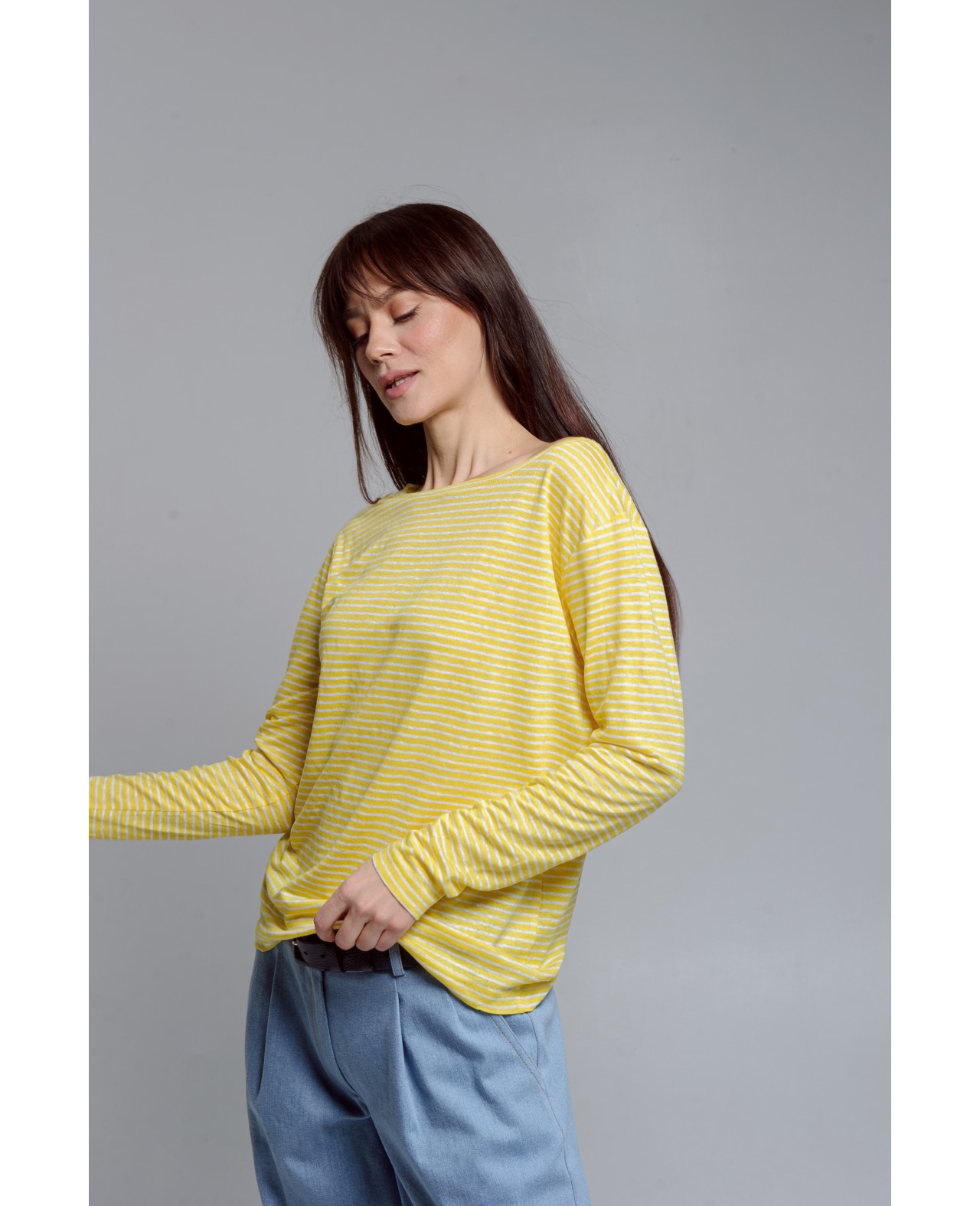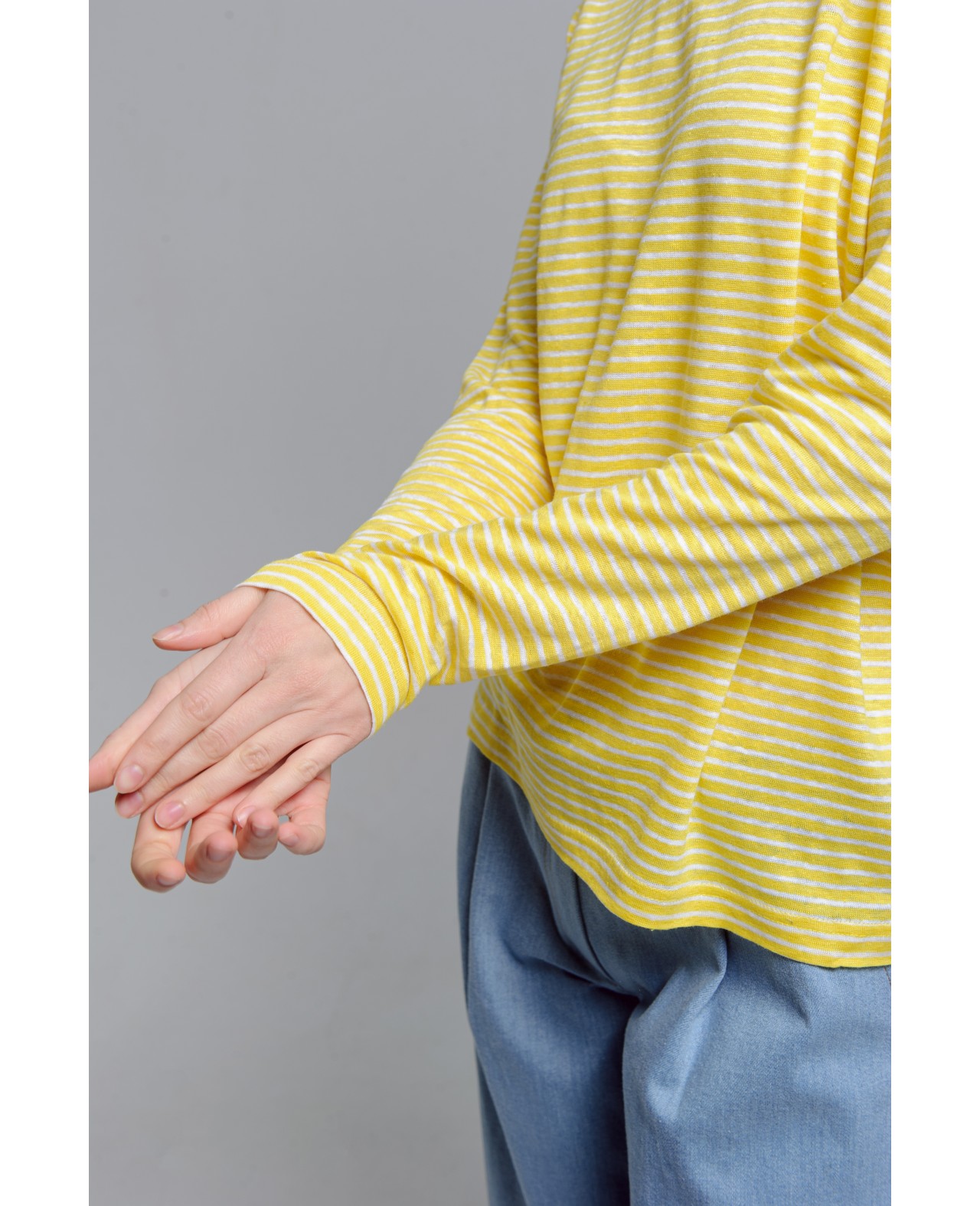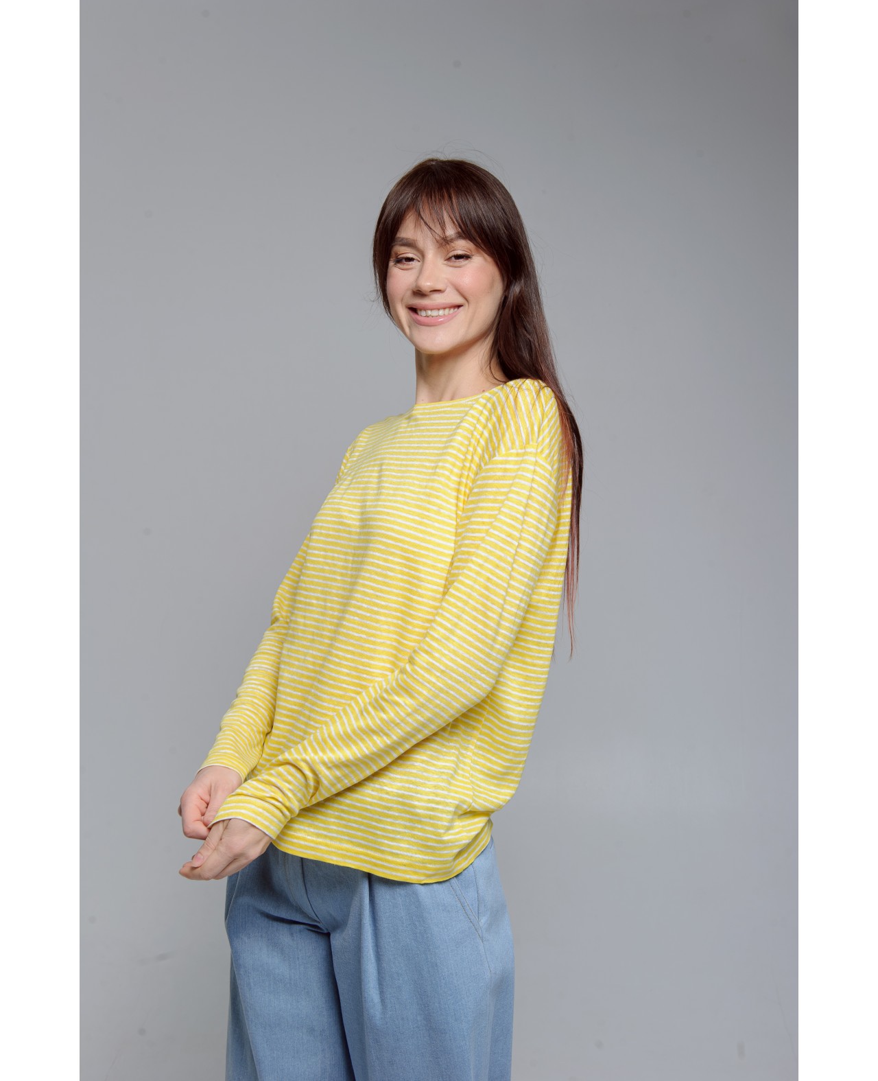 Жёлтый лонгслив в полоску от ANIS выполнен из итальянского льна. Изделие свободного кроя с вырезом  лодочка, со спущенным плечом.