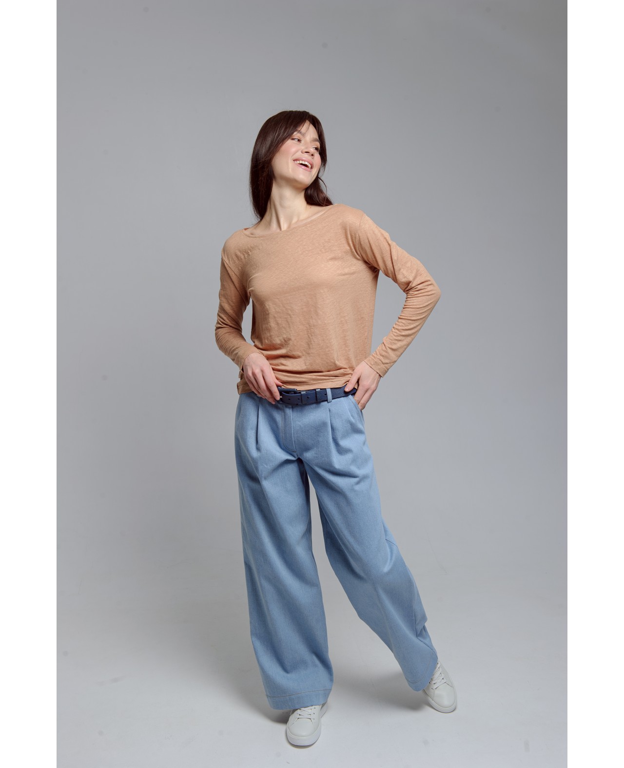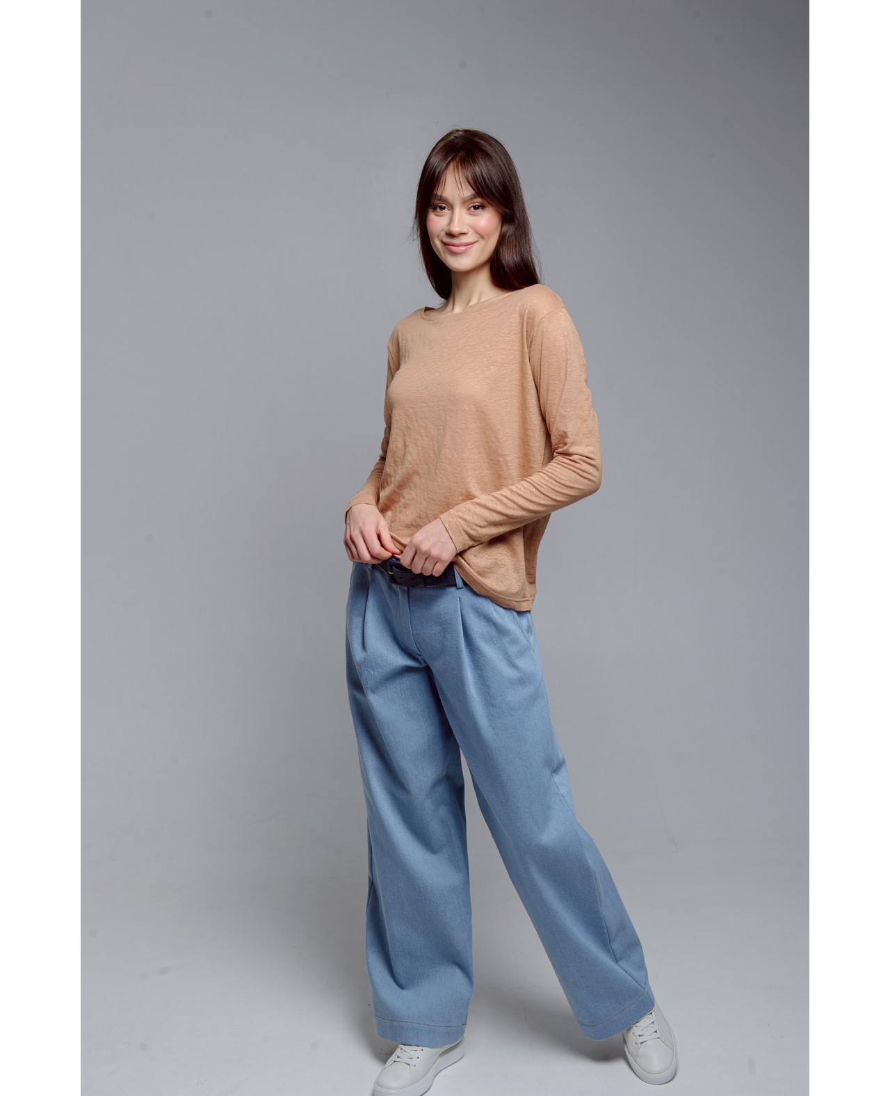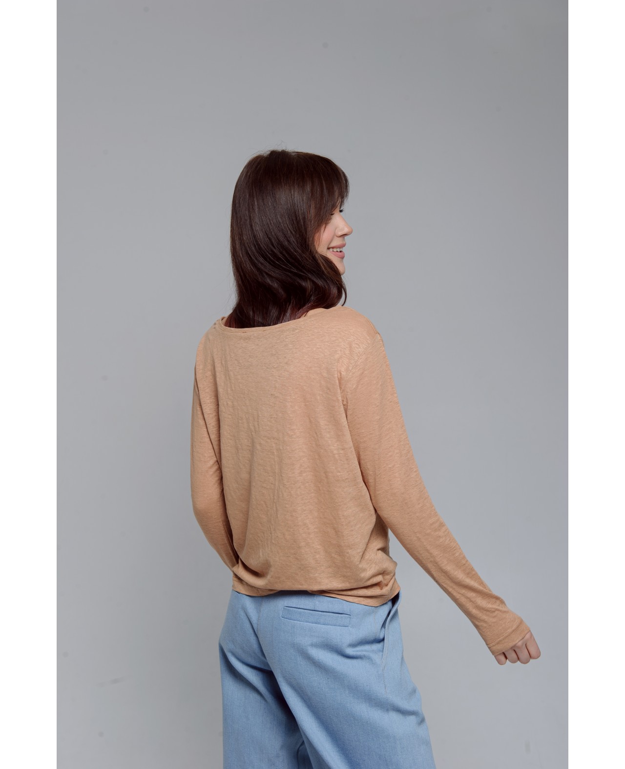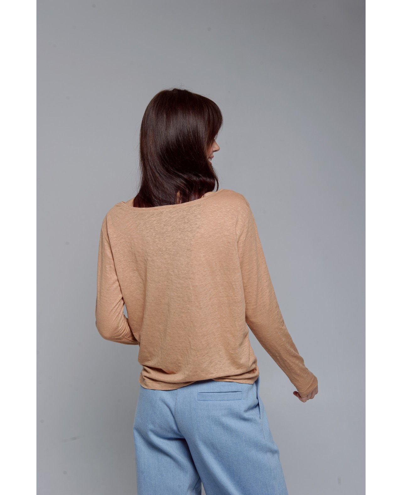 Бежевый лонгслив от ANIS выполнен из итальянского льна. Изделие свободного кроя с вырезом лодочка, со спущенным плечом.